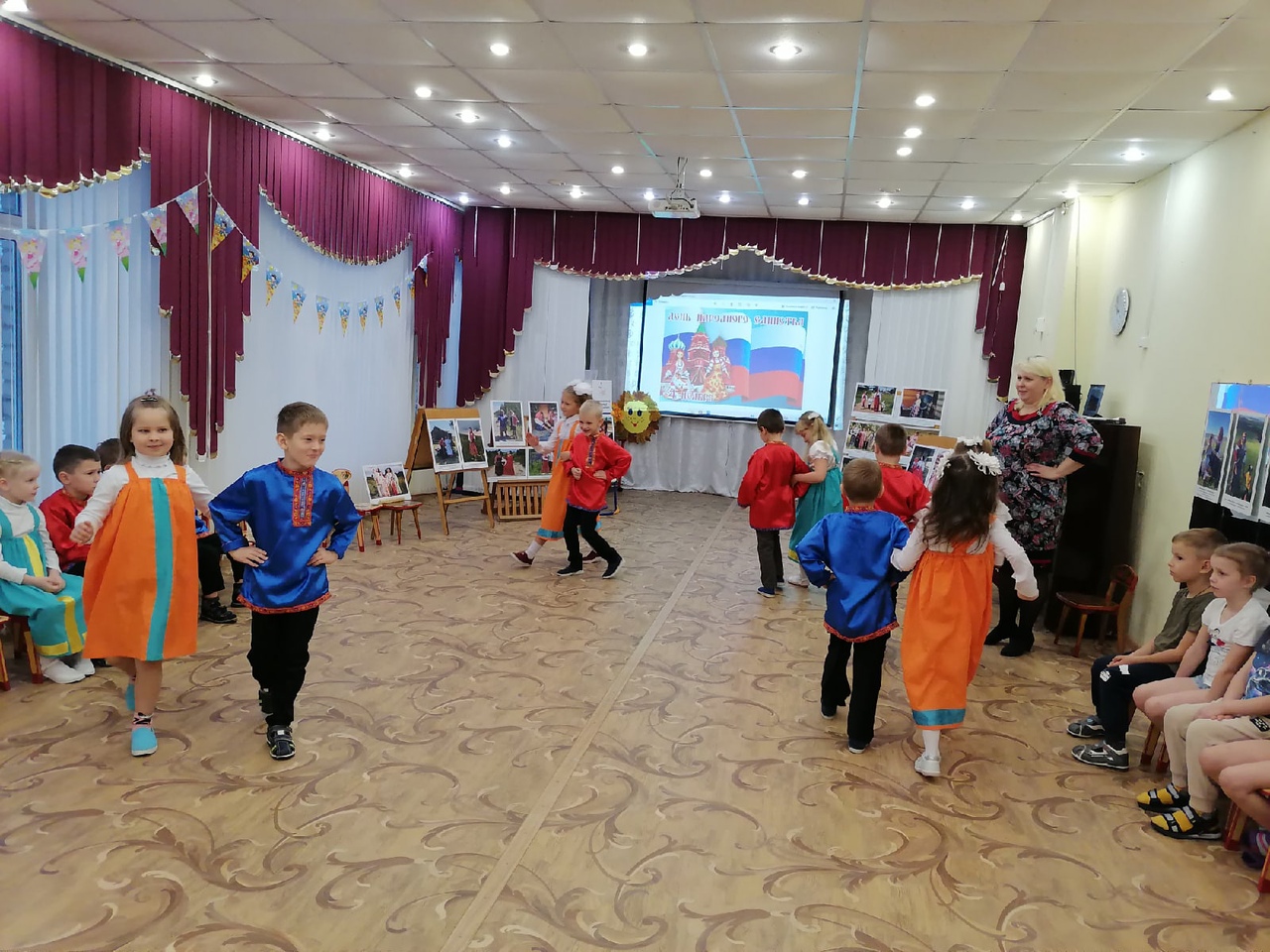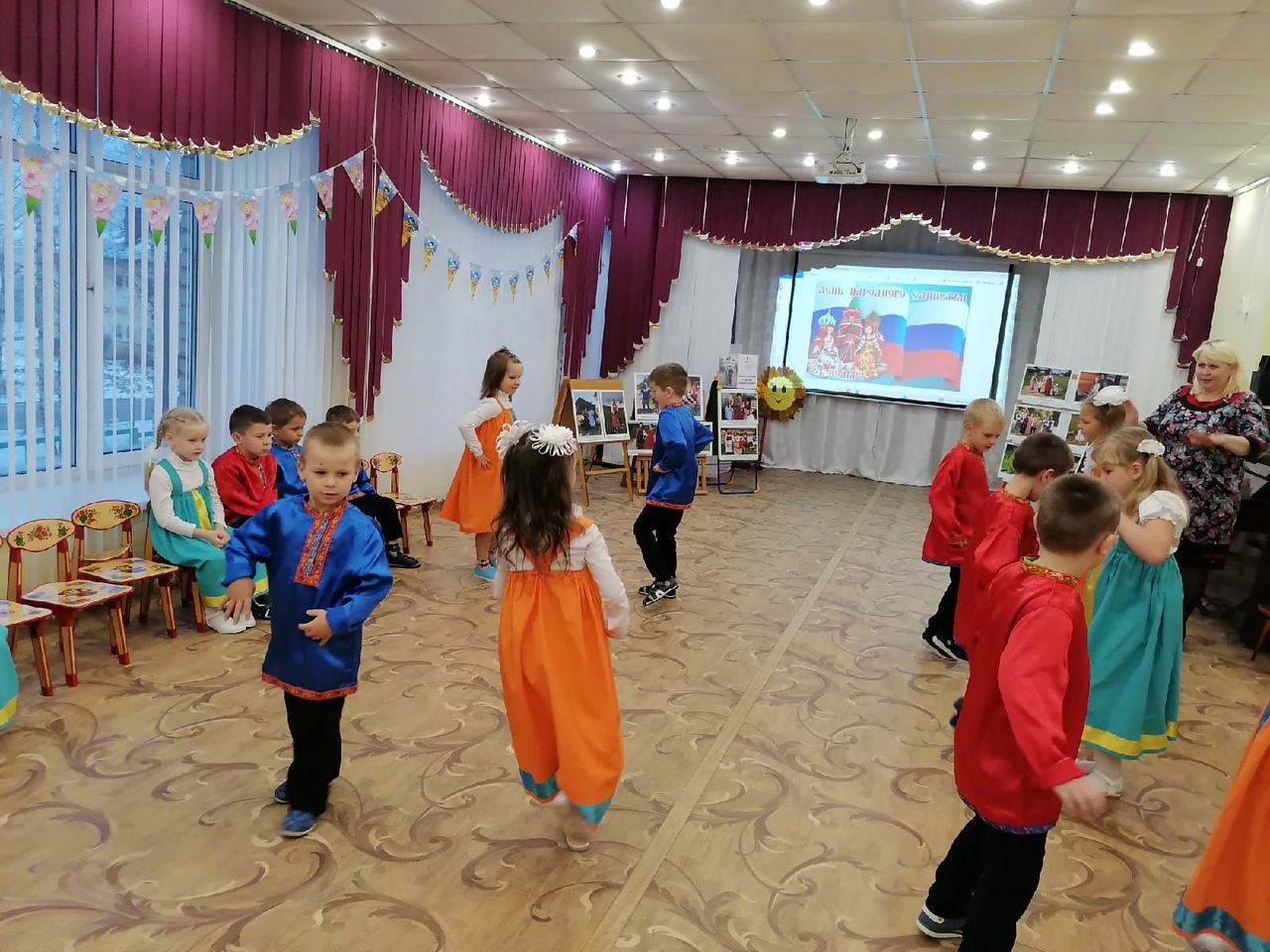 В детском саду прошло мероприятие, посвящённое «Дню народного единства». Ребята узнали о государственном празднике, о том, что наша страна многонациональна. Каждый народ любит свою Родину, прославляет её в стихах, танцах, песнях. Ребята из группы «Загадка» славили свою страну в стихах о Родине, весёлыми частушками и удалой «Кадрилью».