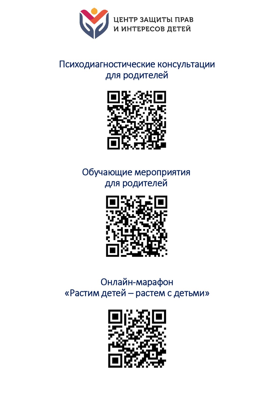Департамент государственной политики в сфере защиты прав детей Минпросвещения России (далее – Департамент) информирует, что в рамках реализации мероприятий по оказанию услуг психолого-педагогической, методической и консультативной помощи родителям (законным представителям) детей, а также гражданам, желающим принять на воспитание в свои семьи детей, оставшихся без попечения родителей, в рамках федерального проекта «Современная школа» национального проекта «Образование» ФГБУ «Центр защиты прав и интересов детей» (далее – Центр) подготовлены и размещены на информационных ресурсах психодиагностические методики для самоисследования родителей по вопросам развития, образования и воспитания детей. В настоящее время доступны к прохождению следующие методики: 1) методика «Взаимодействие родитель-ребенок» (автор – И.М. Марковская), которая направлена на изучение возможных особенностей взаимодействия родителей и детей. Результаты прохождения методики дают возможность родителям узнать уровень их требовательности, строгости, автономности, предоставляемой ребенку, а также уровень родительской тревожности Взаимодействие родитель - ребенок (fcprc.ru) 2) методика «Анализ семейной тревоги» (авторы - Э.Г. Эйдемиллер и В. Юстицкис), которая направлена на самостоятельное определение родителями напряженности в детско-родительских отношениях Анализ семейной тревоги (fcprc.ru) 3) методика «Шкала семейной адаптации и сплоченности» (авторы - Д. X. Олсон, Дж. Портнер, И. Лави, М. Перре), которая направлена на изучение 2 Папоян Ц.Ю. (495) 587-01-10, доб.3495 О направлении информации - 07 представлений родителей о том, насколько сплоченной является семья, а также о том, насколько семья способна адаптироваться при стрессовом воздействии на нее, в том числе в период прохождения детьми экзаменов Шкала семейной адаптации и сплоченности (fcprc.ru) Кроме того, с 1 июня 2021 г. Центром организовано проведение онлайнмарафона «Растим детей – растем с детьми» в рамках Всероссийского дня консультаций родителей по вопросам образования и воспитания детей, приуроченного к празднованию Международного дня защиты детей, трансляция которого доступна для просмотра при регистрации на платформе Онлайн-марафон "Растим детей - растём с детьми" (comdi.com) QR-коды для интерактивного перехода ко всем материалам прилагаются. | |